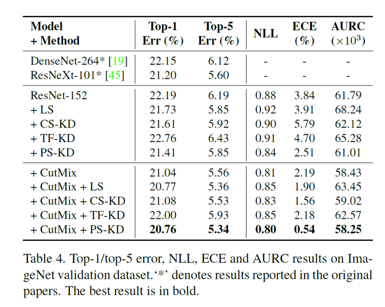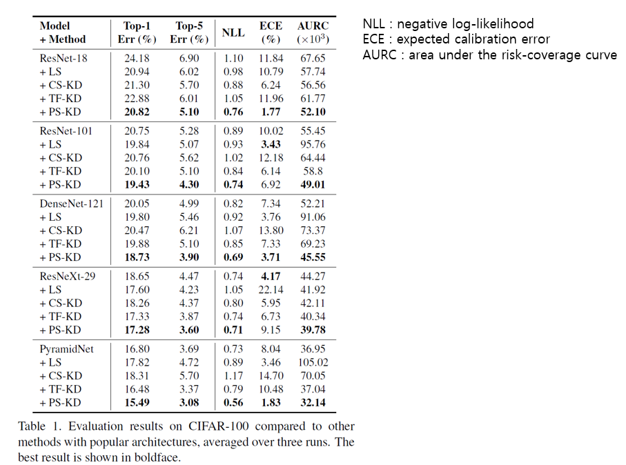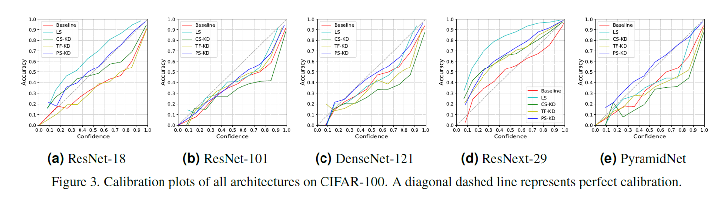 회색 점선에 가까울 수록 calibration plot이 잘되었다고 볼 수 있는데, ResNext-29를 제외하면 PS-KD는 다른 기법들보다 calibration이 잘 된 것을 확인할 수 있습니다.