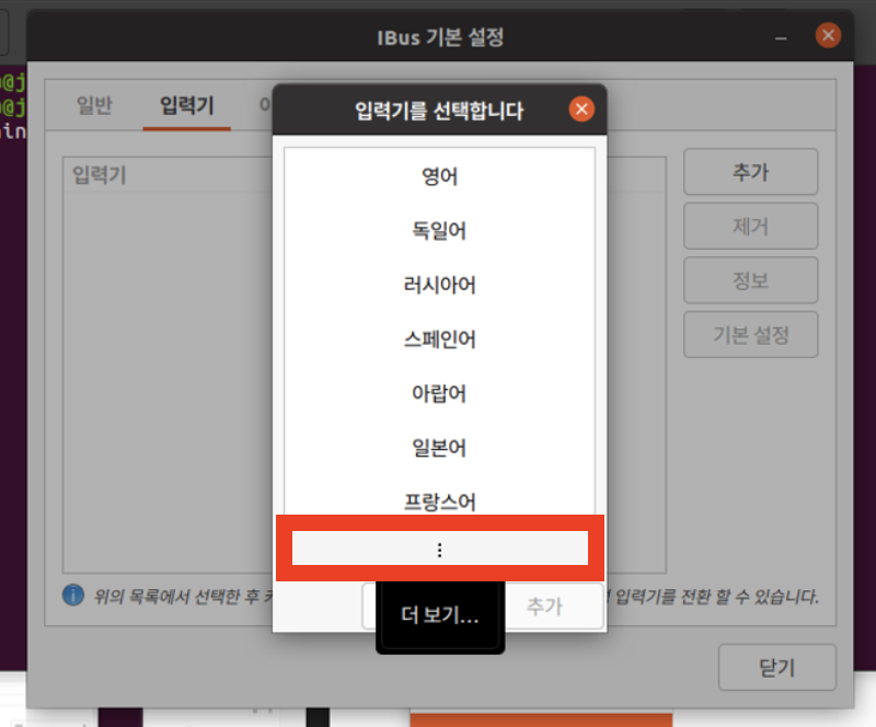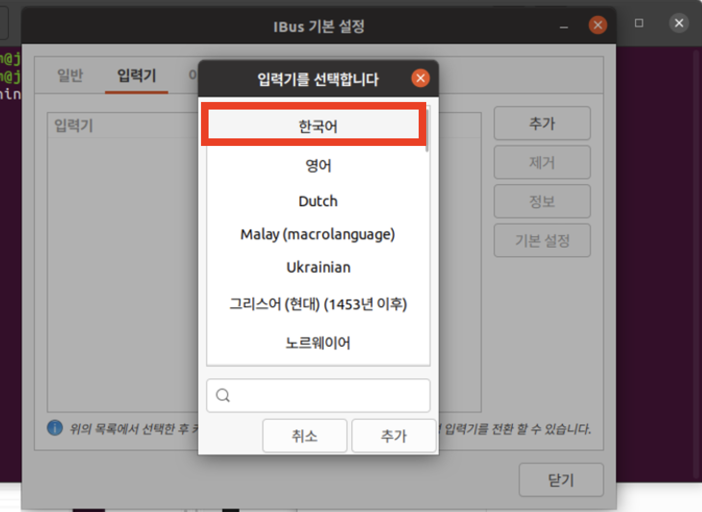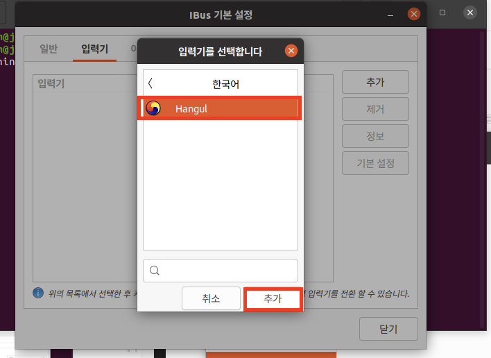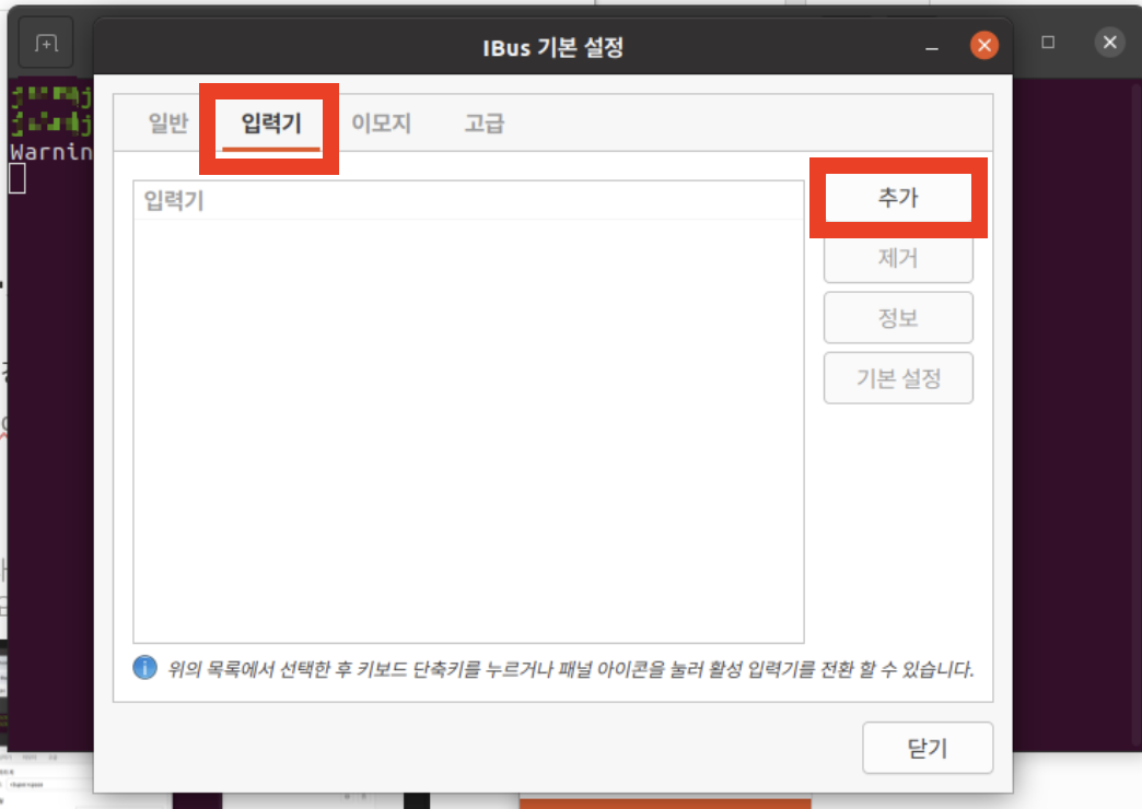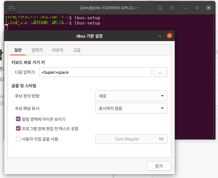 1. terminal 켜서 'ibus-setup' 명령어로 IBUS 설정 창열기