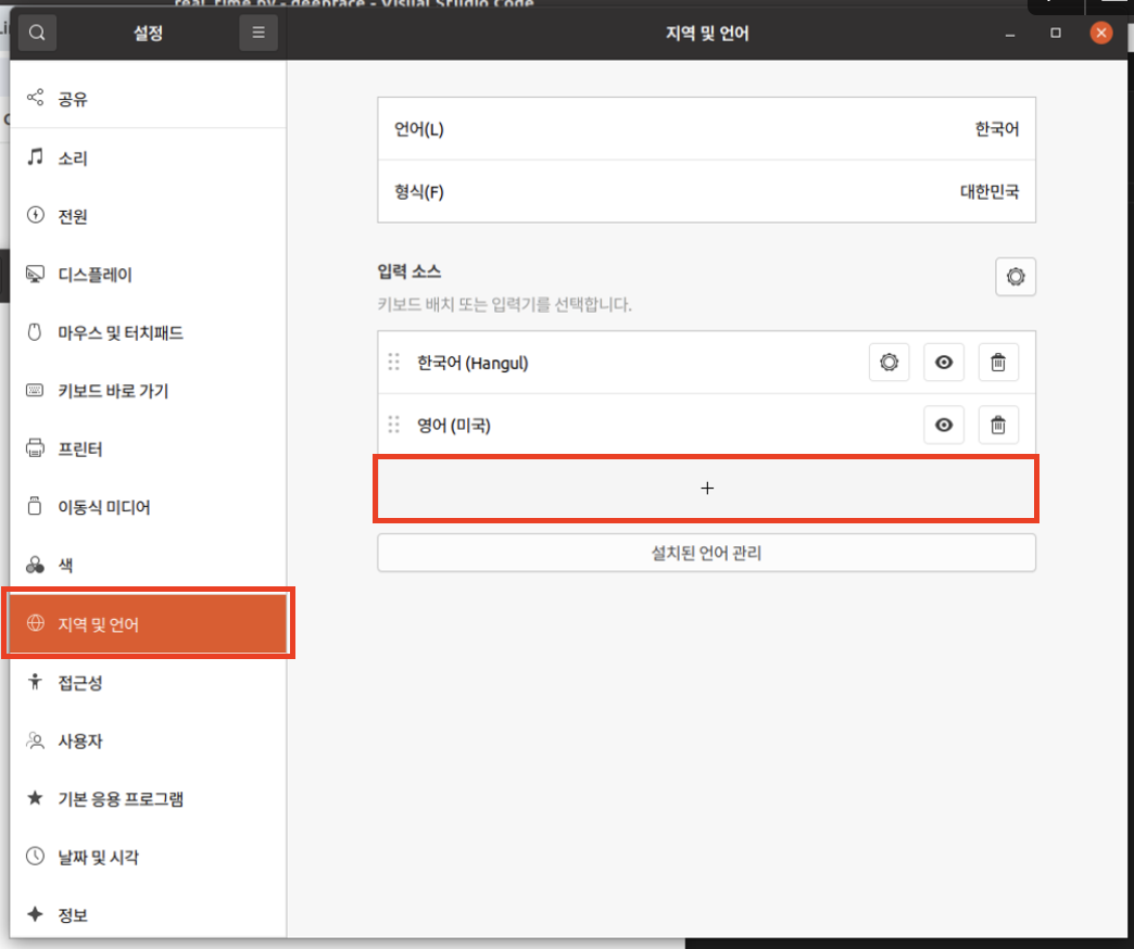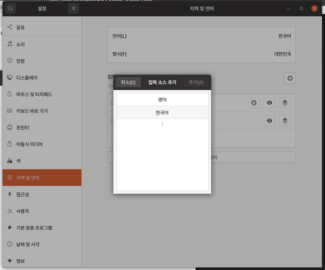 3. 리눅스 settings 창 열어서, input sources - + 버튼 클릭 - Korean - Korean (Hangul) 추가