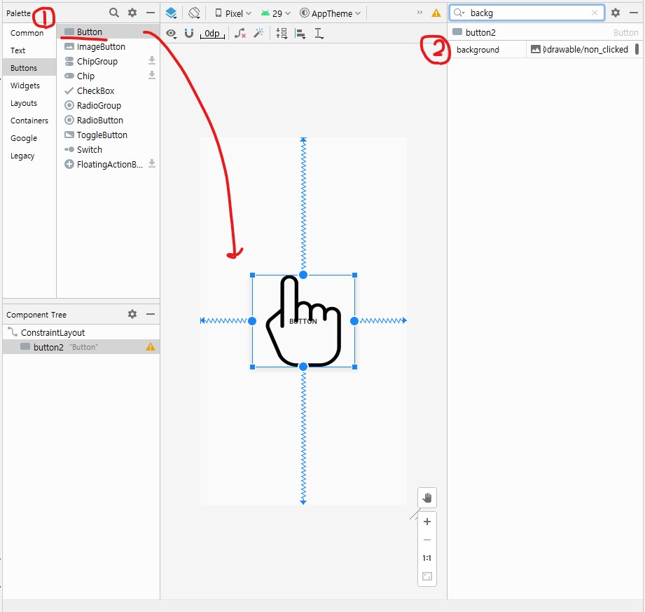 버튼이 클릭 된 상태로 Attribute창의 background에 @drawble/non_clicked을 입력해주면 이미지가 배경으로 설정된다.