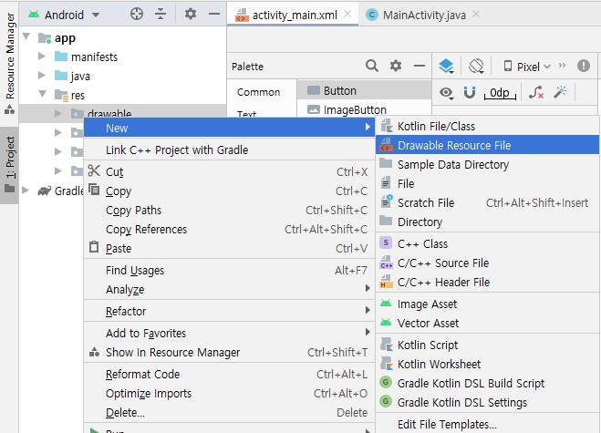 /app/res/drawable 폴더에서 오른쪽 버튼을 눌러 New-Drawable resouce file을 선택한다.