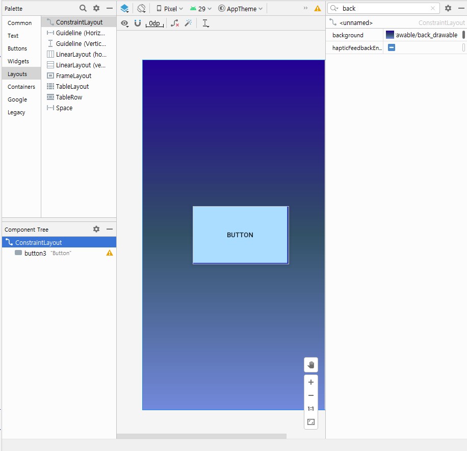 activity_main.xml 파일을 열고 디자인 화면의 좌측 하단에 있는 Component Tree 창에서 최상위 레이아웃인 ConstraintLayout을 선택하고, background 속성 값을 @drawable/back_drawable 로 변경한다.