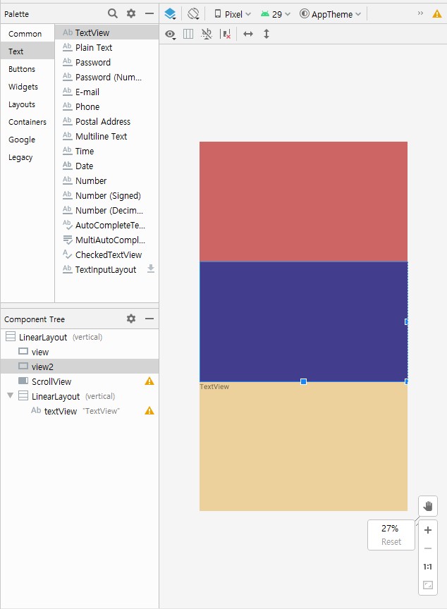 화면의 텍스트 뷰는 삭제하고 팔레트 창의 widgets에서 두개의 View를 contatiners에서 한개의 ScrollView를 추가하자.