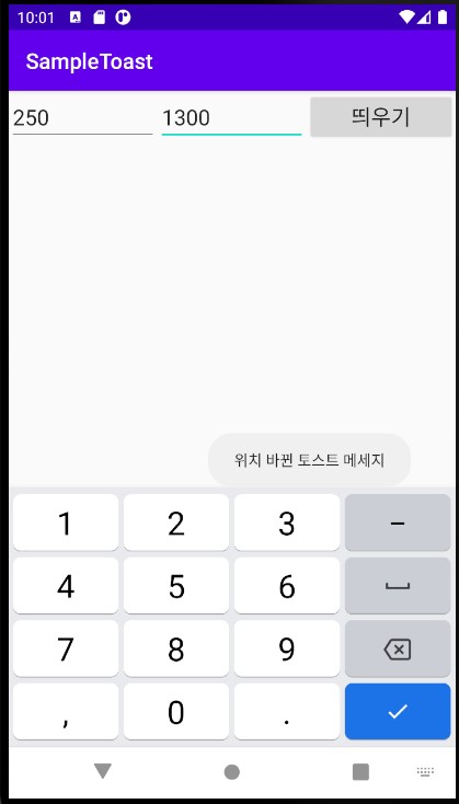 실행시켜보면 입력한 값에 대해 토스트 메세지의 위치가 달라진 것을 확인할 수 있다.