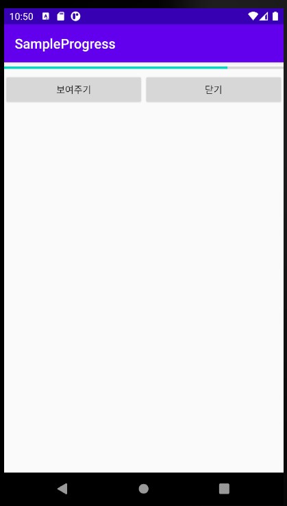 -막대 모양 : 작업의 진행상태를 막대 모양으로 표시, style 속성 값을 '?android:attr/progressBarStyleHorizontal'로 설정한다.