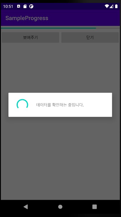 '보여주기' 버튼을 누르면 대화상자에 원형 프로그레스바가 나타나는 것을 확인할 수 있다.