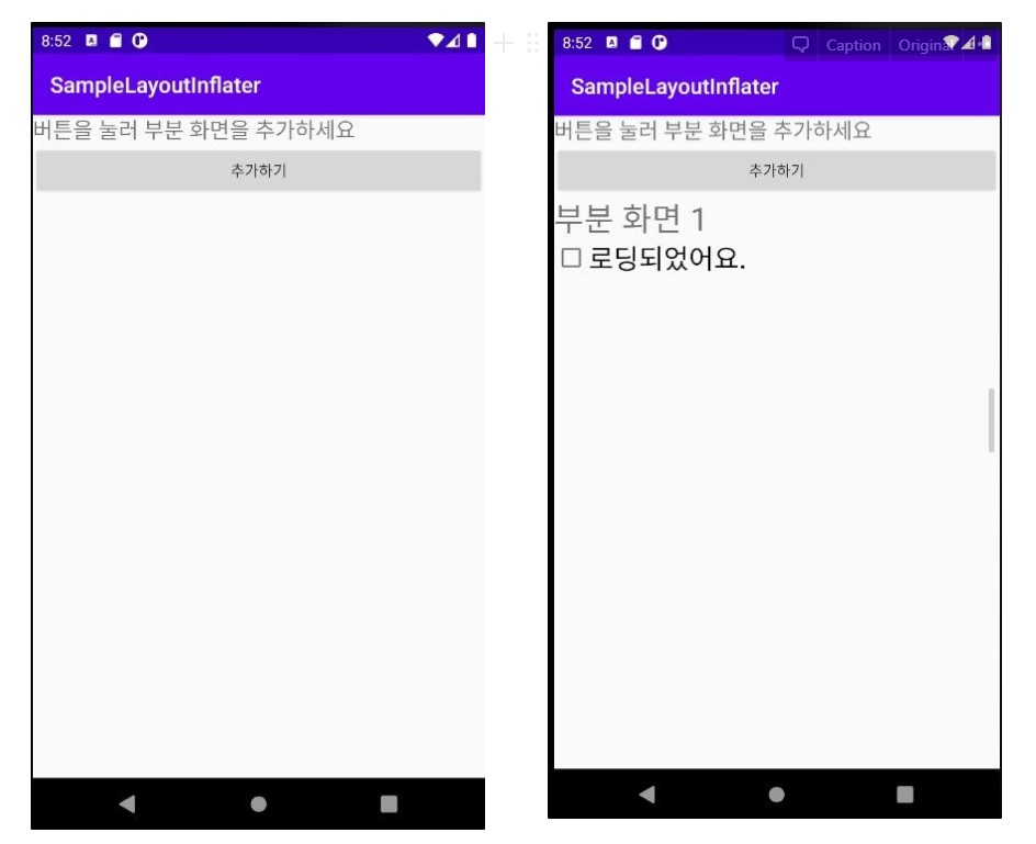 왼쪽은 sub1.xml을 로딩하기 전이고 오른쪽은 인플레이션을 통해 부분 레이아웃(sub1.xml)을 로딩한 후의 화면이다.