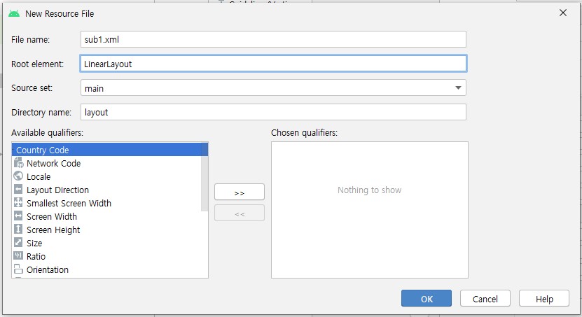 Root element: LinearLayout을 입력한 후 OK 버튼을 눌러준다.