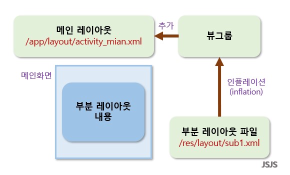 화면의 일부분을 차지하는 것을 부분화면이라고 부를 수 있는데 전체 화면이 아닌 부분 화면도 별도의 XML 레이아웃 파일에 정의한 후 불러와 보여줄 수 있다.