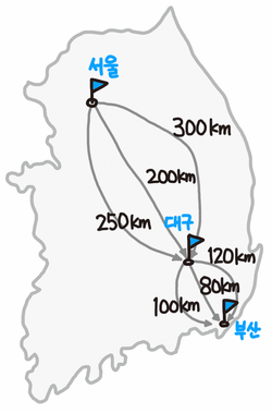 가장 단 기간에 서울애서 부산까지 도착하는 거리를 구하려면 그 순간 순간 가장 빠른 최단 경로를 구하면 된다.