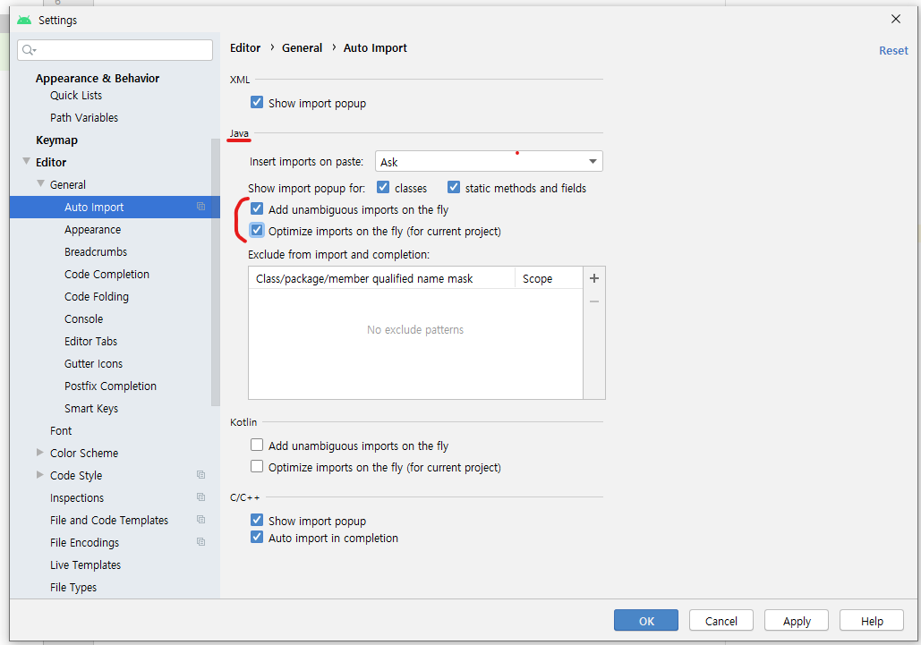 - 자바로 코드를 작성하기 전 자동으로 import 해주는 기능을 설정해주자.